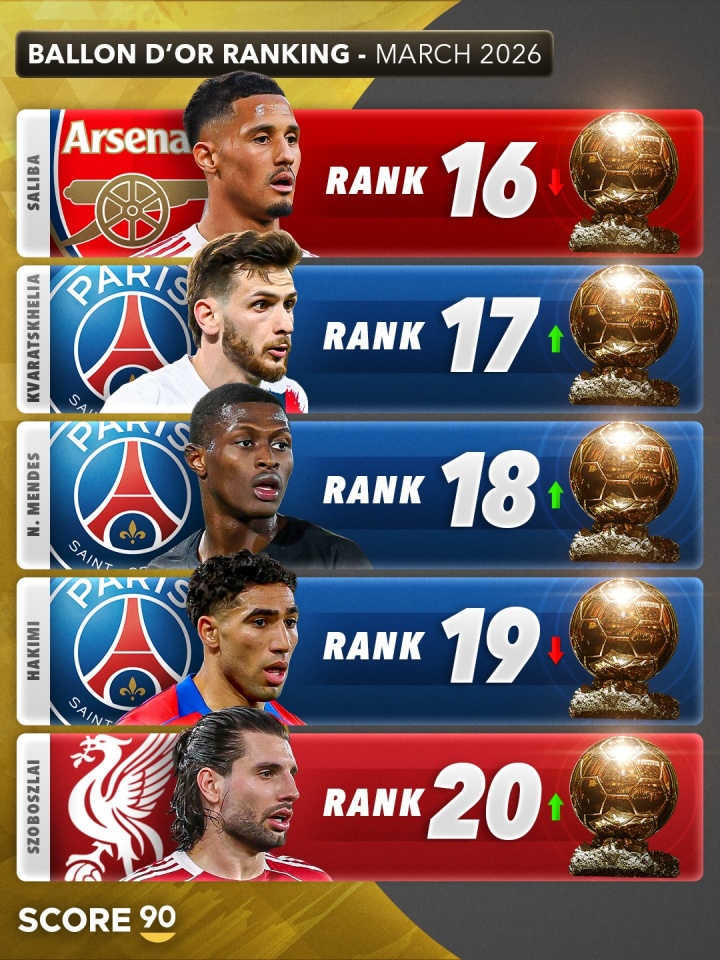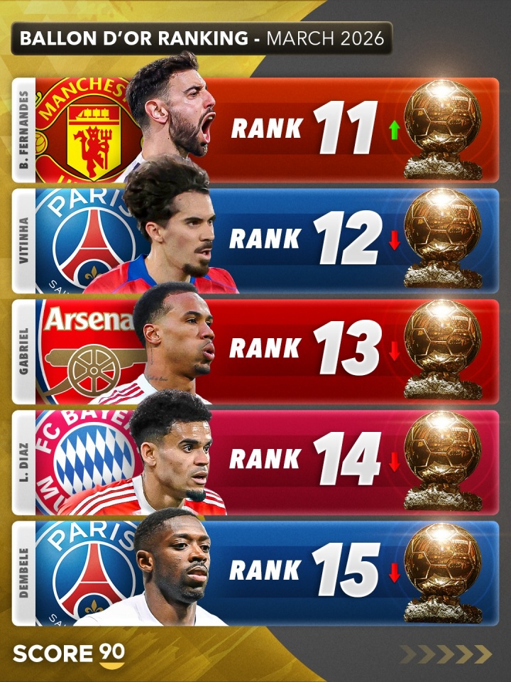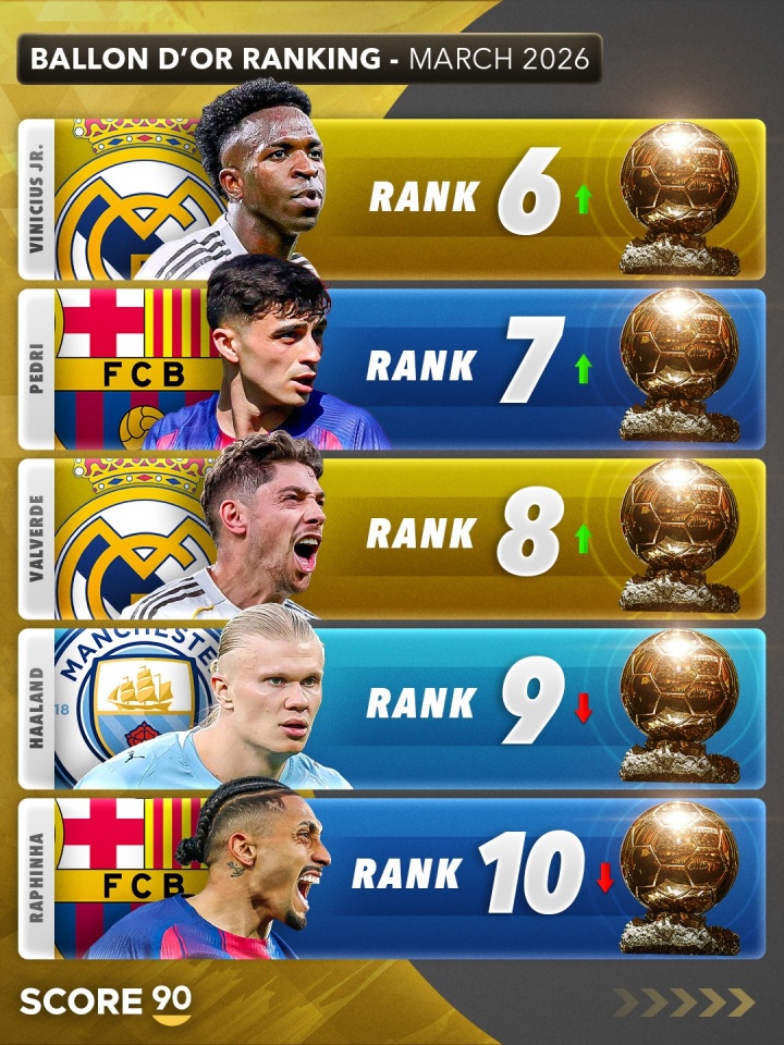 03月26日讯 Score90对到3月底为止,各大球员的表现做了盘点,并更新了他们对金球奖在现阶段的排名情况。其中,亚马尔超远姆巴佩升至第一,详细如下。